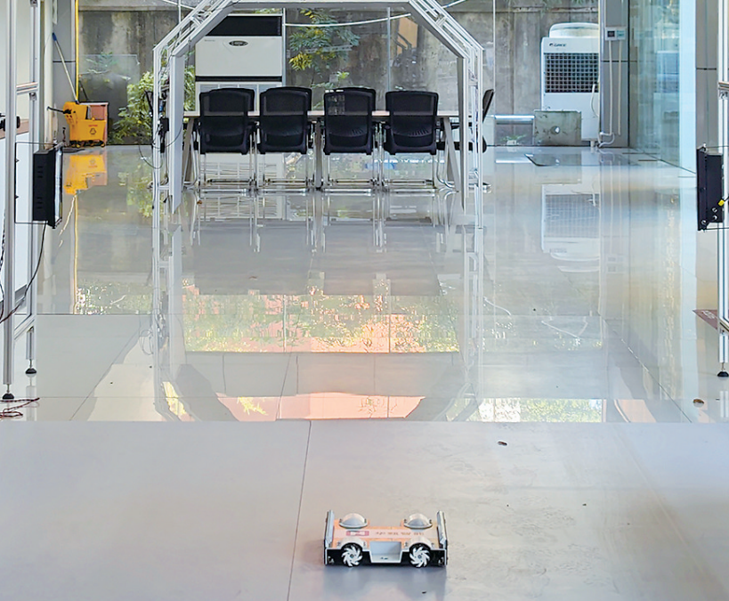 地面上看上去像玩具赛车的就是底盘检测机器人。
